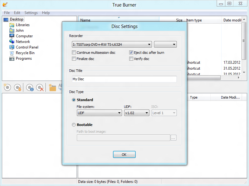 True Burner is simple, but powerful free burning software, which enables you to make and burn standard, multisession and bootable CD, DVD, Blu-ray Disc with various file systems, including ISO 9660 and UDF. With True Burner you can create Data and MP3 Discs, DVD-Video.